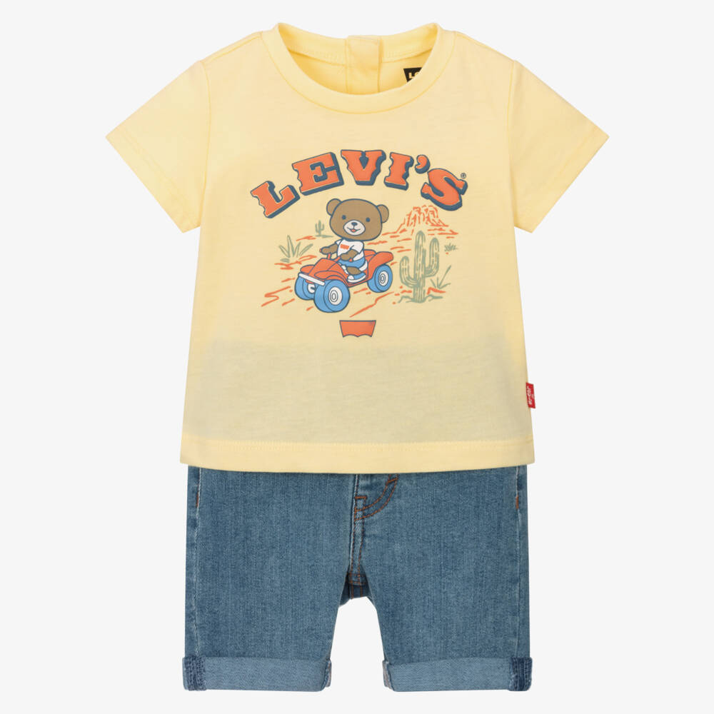 A cool and casual denim shorts set for little boys by Levi's. The yellow cotton blend T-shirt has a cute bear driving off-road printed on the front. The blue denim shorts have slight stretch for comfort and are finished with the brands iconic Red Tab on the back pocket for instant recognition.