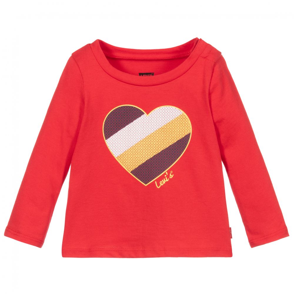 A red top for little girls by Levi's, made in a soft cotton jersey. It has a gold, navy blue, white and red heart print with a tiny logo on the front, with popper fastening on one shoulder on smaller sizes.