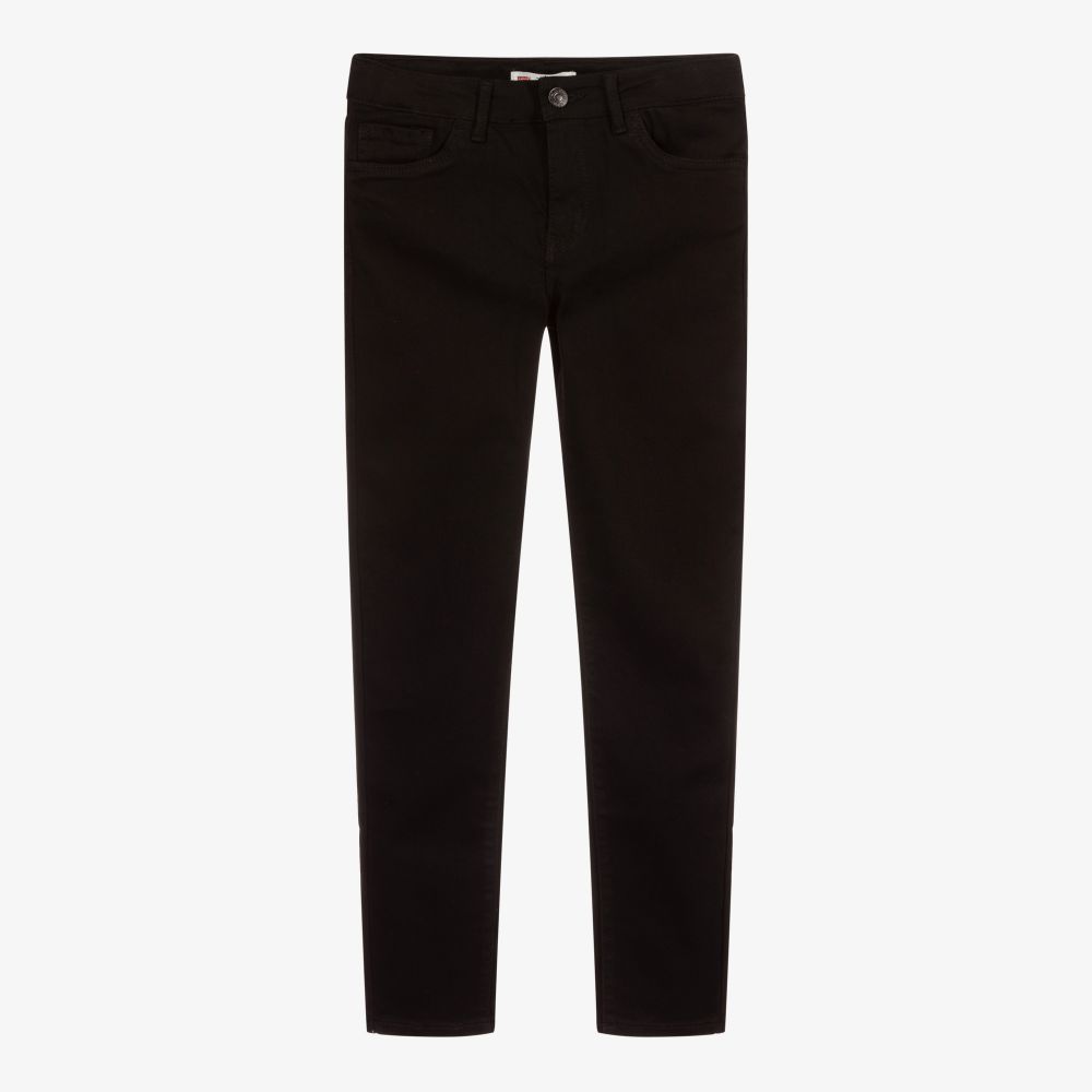 Teen girls black denim 710 jeans by American brand Levi's, with a washed and worn look. The adjustable waistband has a 2-Horse logo badge and the iconic Red Tab logo is on one of the back pockets. Soft, lightweight and stretchy, these comfortable, super skinny fit jeans are made with sustainable Repreve® fibre, made from plastic bottles.