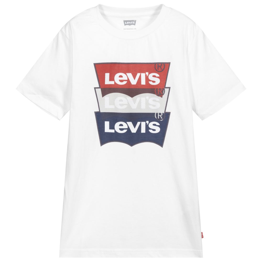 Classic white T-shirt for teen boys by Levi's, made in soft cotton jersey. It has the designer's logos in red, white and blue on the front.