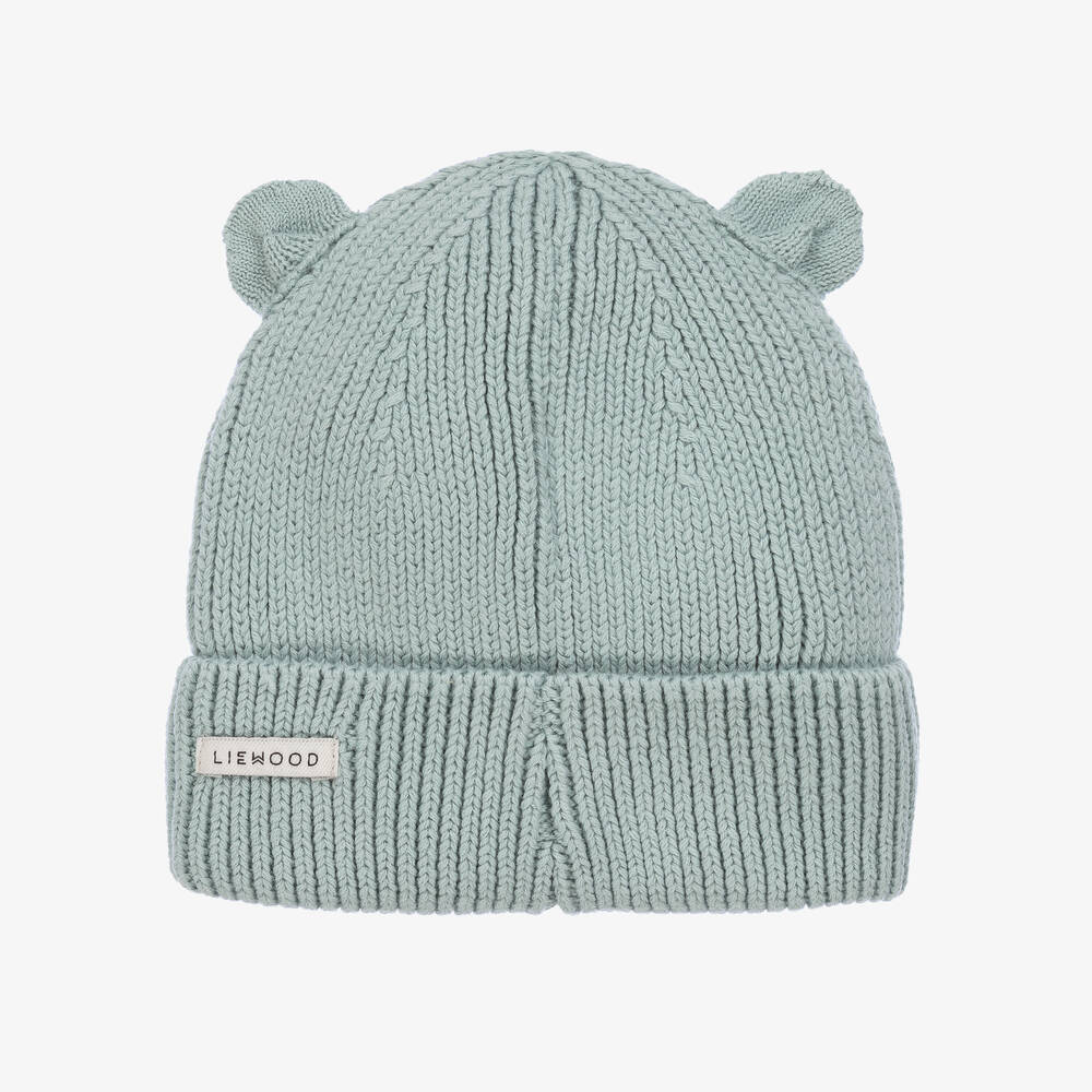 Pale blue organic cotton beanie hat for younger boys and girls by Danish brand Liewood, in a chunky ribbed knit. Warm and cosy for cooler months, it has cute 3D ears on the top and a turned-up brim with a little logo tab stitched on the back, adding a subtly branded finishing touch.