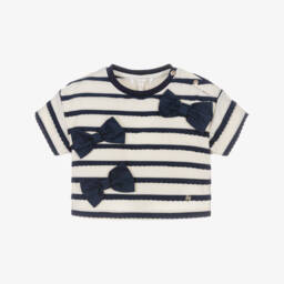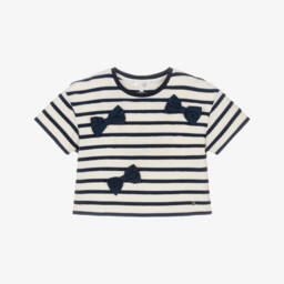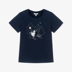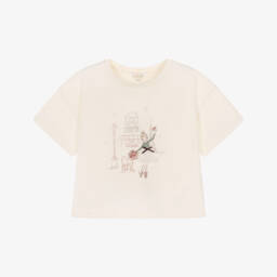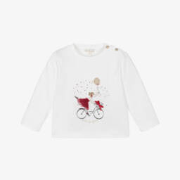 A charming white cotton T-shirt for girls by Lili Gaufrette, sure to become her go-to top. Made in soft, comfortable jersey, it has an enchanting ballerina and balloon print with frilly 3D georgette appliqués. Shiny gold accents add a touch of glamour.