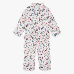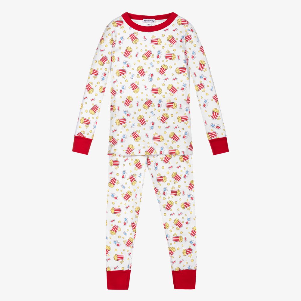 White long pyjamas for boys and girls by Magnolia Baby, made in super soft and stretchy Pima cotton jersey. They have a red and yellow popcorn and cinema themed print and red trims.