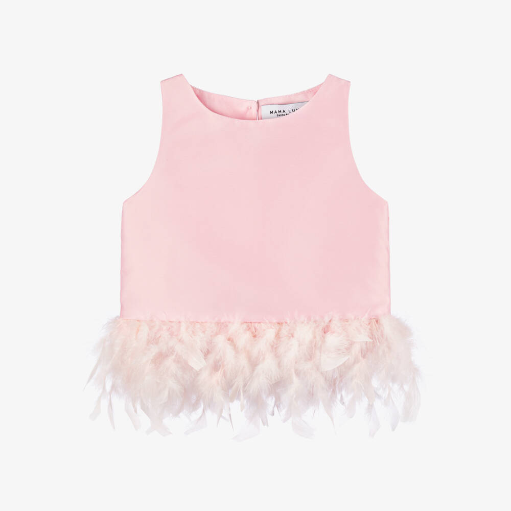 Beautiful pink sleeveless top for girls by Mama Luma, made in lustrous satin twill with delicate feathers trimming the waist. This handmade design has a comfortable, lightweight lining and fastens with a stylish keyhole button on the back.