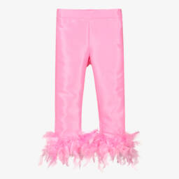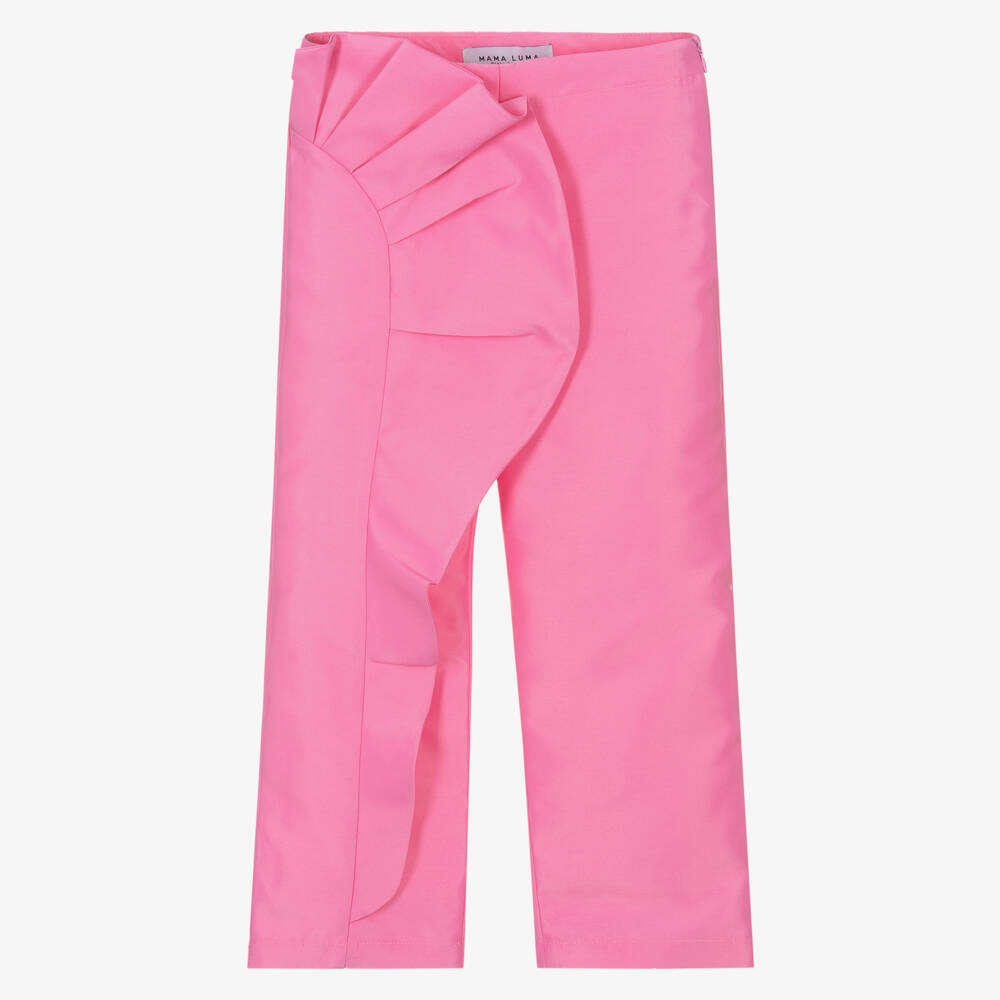Gorgeous pink trousers for girls by Mama Luma, handmade in lustrous satin twill with a statement ruffle on the front. They fasten with a neat, concealed zip on the side and have an adjustable waist for a comfortable fit.