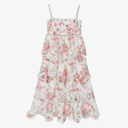 A beautiful lace dress for older girls by Marlo Kids, in a soft ivory colour palette. This cotton-lined dress has a beautiful overlay on the bodice and an open shoulder design for a more sophisticated look. Close-fitting straps, made in soft velvet, sit high on the neckline and adjust with buttons on the back. Beautiful scalloped trims and delicate crochet circles add contrasting texture.