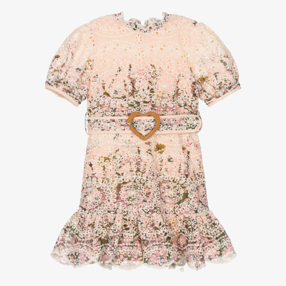 A two-tone pink dress for girls by Marlo Kids, made in the brand's signature cotton fabrication with intricate floral embroidery. This short-sleeved style has a scalloped neckline and a complementing ruffled hem for beautiful movement when she twirls. The adjustable belt around the waist fastens with a heart-shaped buckle, adding a romantic touch to this knee-length dress.