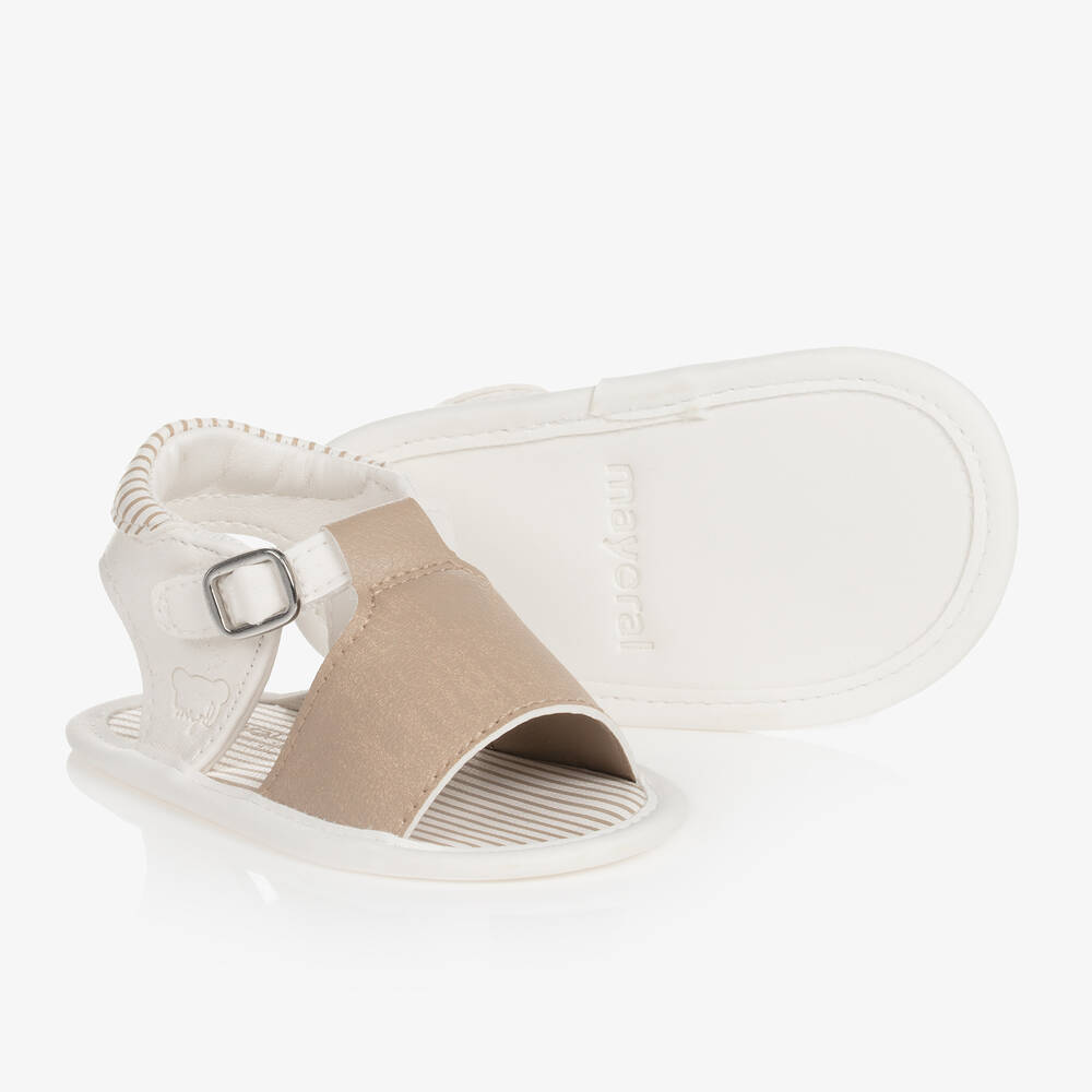 Beige faux leather pre-walker sandals for baby boys from Mayoral. They have a strap around the ankle for a secure and supportive fit and the insole is lightly cushioned for added comfort. They have a faux buckle on the velcro-fastening strap for a stylish finish.