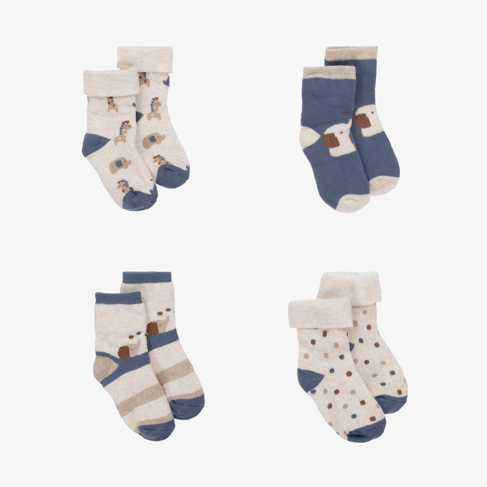 Four pairs of blue and beige marl socks for baby boys by Mayoral, made in a soft cotton blend. Comfortable for little feet, they have an assortment of patterns including polka dots and playful zoo animals. They have colour-contrast toes and heels and two pairs have folded cuffs. This item contains organic cotton.