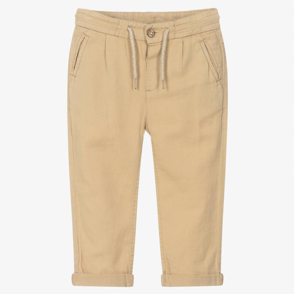 Beige trousers for little boys by Spanish brand Mayoral, made in a lightweight cotton and linen blend. Just right for casual days, they have a relaxed fit and an adjustable waist with a drawstring for a good fit. There are both front and back pockets and cute, fixed turn-ups on the cuffs.