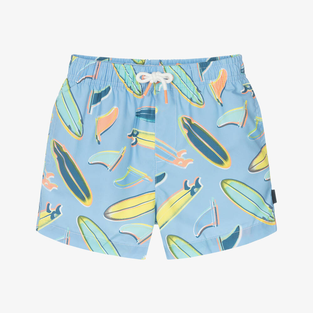 Sky blue swim shorts for boys by Mayoral, with a fun, colourful surfboard print. Silky smooth and lightweight, they have a soft mesh lining for comfort. There are side seam and back pockets and a useful drawstring waist.