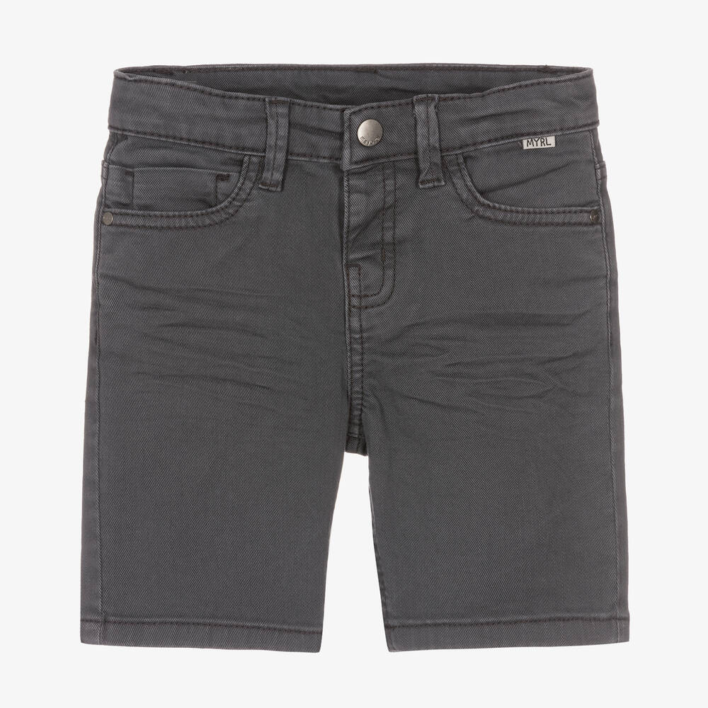 Grey sustainable cotton shorts for boys by Spanish brand Mayoral. Perfect for casual, relaxed days, they are Bermuda length and made in lightweight, stretch denim. In five-pocket jeans style, they have a washed and worn look, with creases on the legs. The waistband fastens with a popper and is adjustable, giving a good fit.