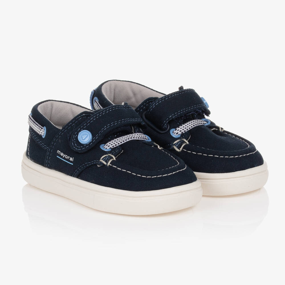 Little boys navy blue deck shoes by Mayoral. Made in soft canvas, they have a rounded toe with contrast white stitching and a velcro strap fastening. They have a fabric lining and inner sole and a non-slip rubber outer sole.