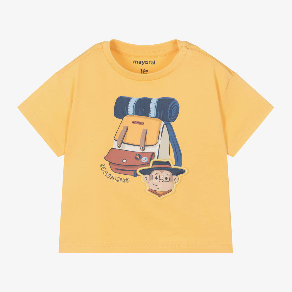 Yellow cotton oversized T-shirt for little boys by Spanish brand Mayoral, made in soft, comfortable jersey with short sleeves. Ideal for young adventurers, it has a backpack printed on the front, with a fun monkey appliqué in yellow, brown and blue. There are convenient popper fastenings on one shoulder to make getting dressed easy.