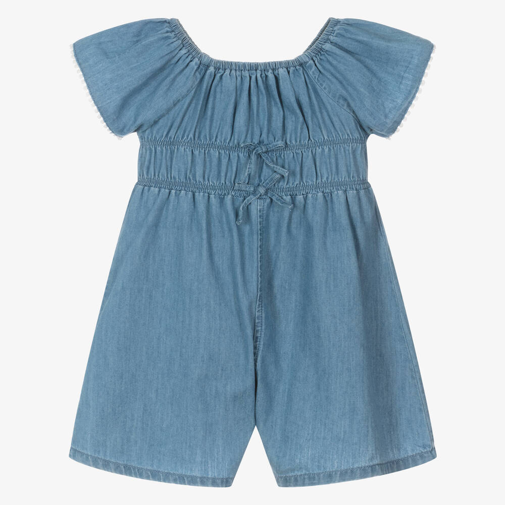Blue chambray playsuit for younger girls by Mayoral, made in a soft cotton and lyocell blend. It has an elasticated neckline and waist, making it easy to pull on. There is delicate white detailing on the sleeves and simple popper fastenings between the legs.