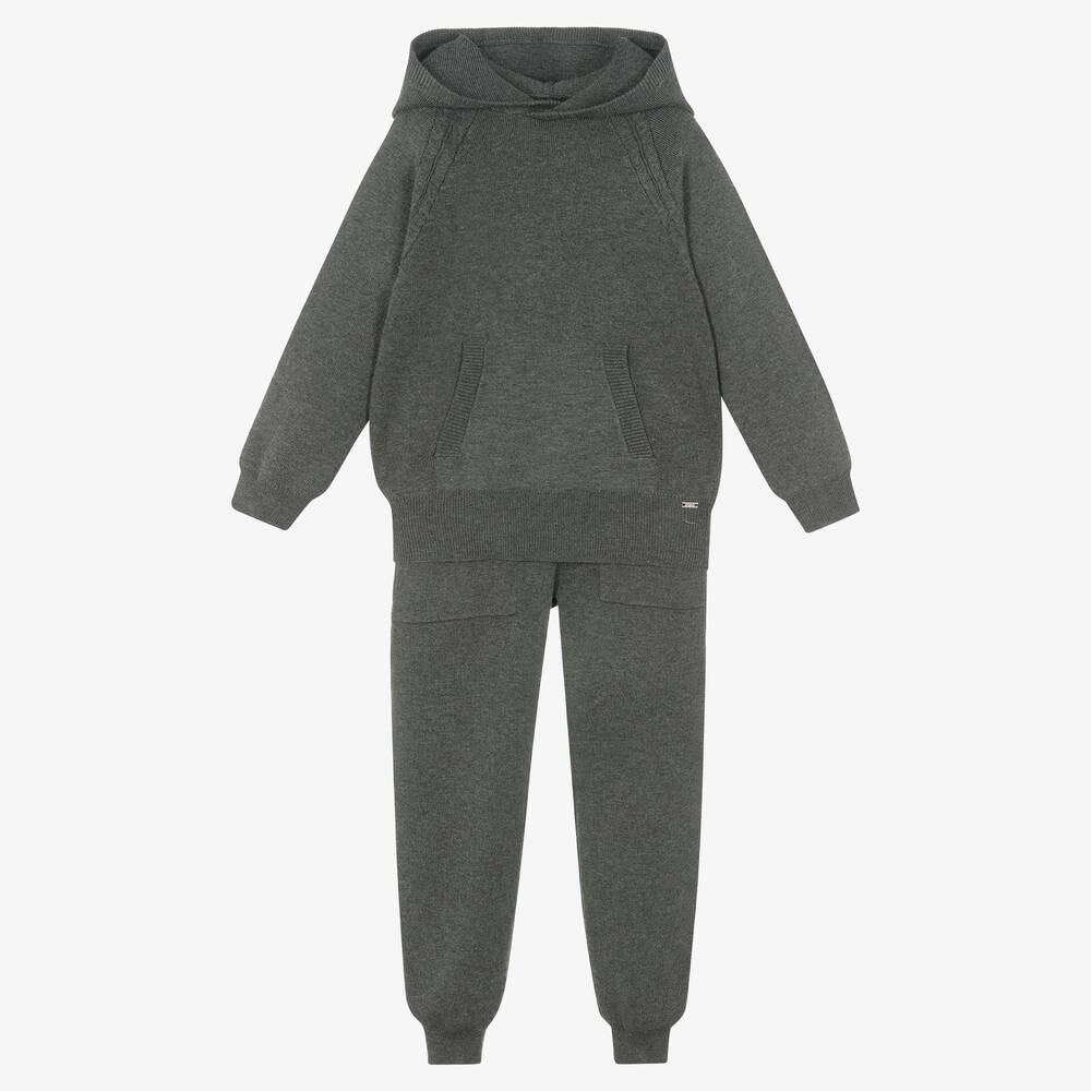 Grey tracksuit for girls by Mayoral, made in a soft, fine knit. The hoodie has cable knit raglan sleeves, a front pouch pocket and a silver logo plate on the ribbed hem. The joggers have front patch pockets and a faux drawstring on the comfortable elasticated waist.