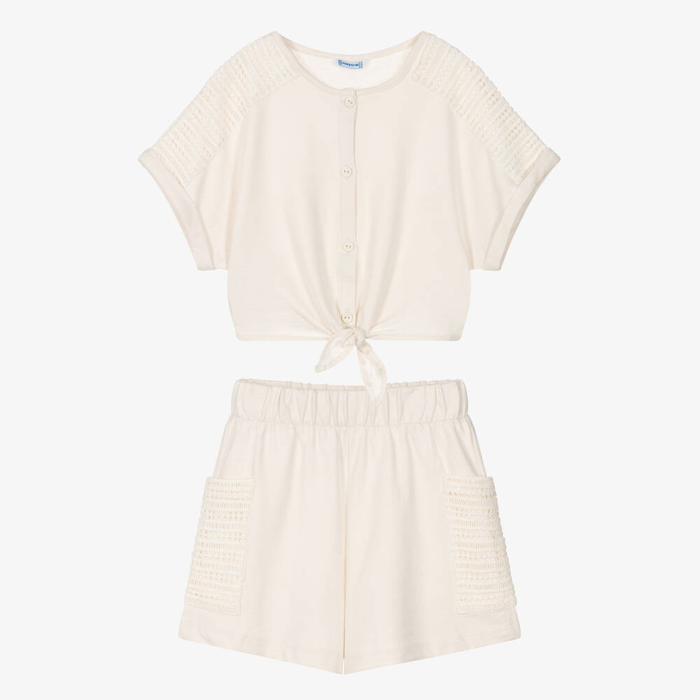 Casual ivory jersey shorts set for older girls by Mayoral, with lovely crochet-inspired panelling. Short and boxy, the top buttons up on the front and has a tie detail on the elasticated hem. In a simple pull-on style, the shorts have sheer slip pockets.