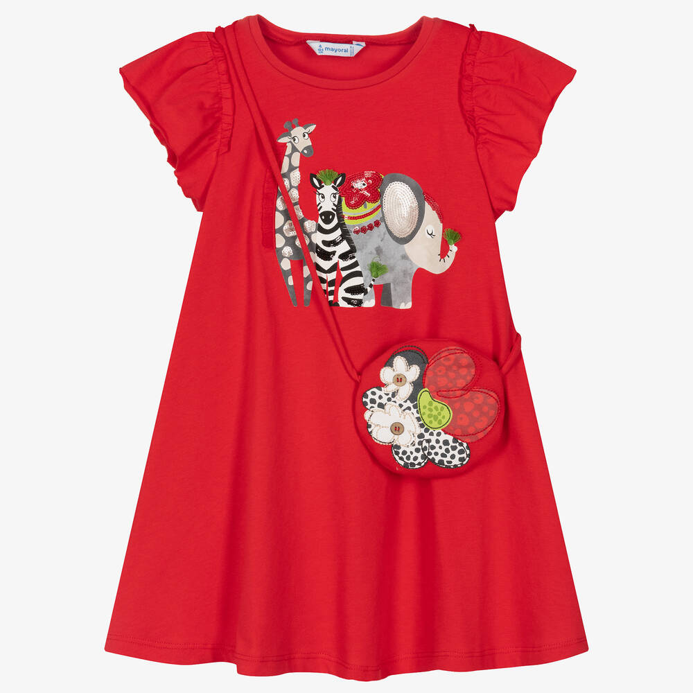 Girls pretty red cotton dress and bag set by Mayoral, made in soft and comfortable jersey. Printed with a sweet jungle animal design, it has shiny sequin and button trims. The dress has short frill sleeves and slips on easily over the head for easy wear. The matching bag completes the look beautifully and fastens with a velcro patch.