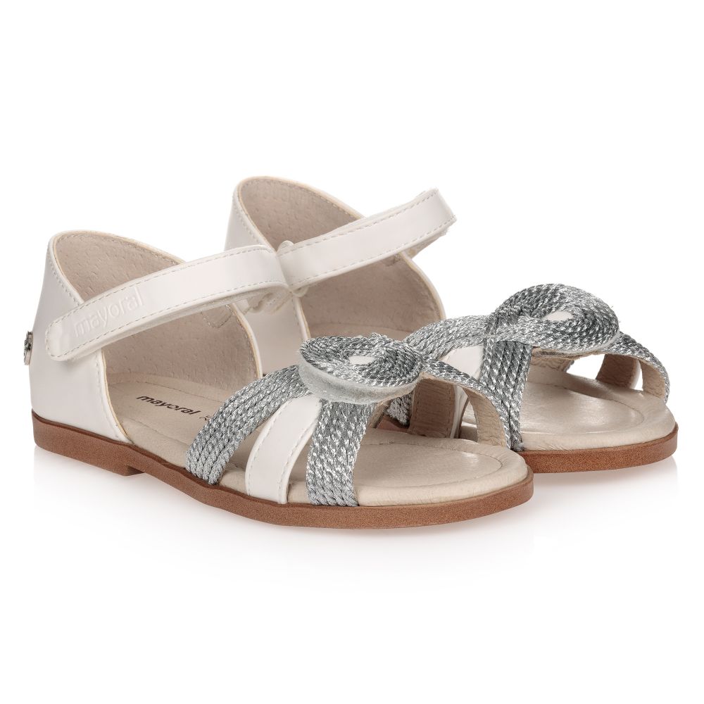White faux leather sandals for little girls by Mayoral. The faux leather and textile upper fasten with velcro at the ankle, and have a silver velcro rope strap across the foot as well. The insole is comprised of real leather and the outer sole is made in brown leather.