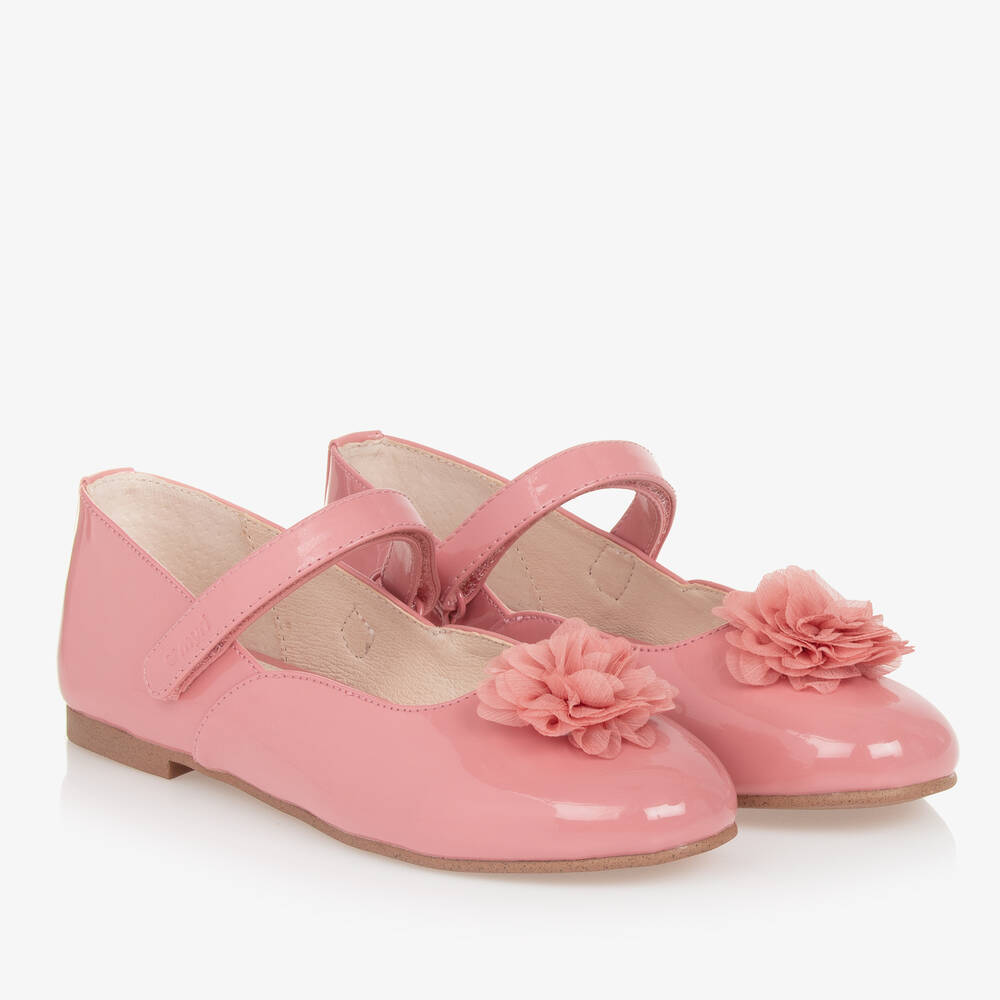 Beautiful pink patent ballerina pumps for teen girls, by Mayoral. Made in smooth and glossy faux leather, these stylish shoes have a decorative fabric flower on the front. They fasten across the foot with a velcro fastening strap, embossed with the designer's logo for a discreet designer detail. Lined in soft and supple leather, they have lightly padded insoles and non-slip rubber outer soles for a good grip underfoot.