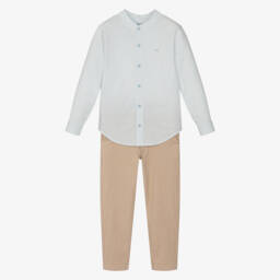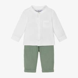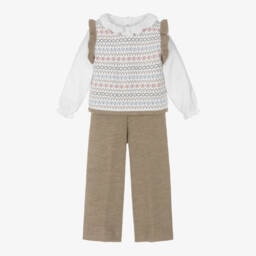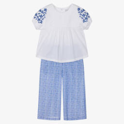 A gorgeous white and pink trouser set for girls by Mebi. Patterned with a charming floral print, the sleeveless top has a frilled collar and hem, trimmed with delicate lace. It pairs beautifully with the lightweight linen blend trousers. Styled in a wide-leg silhouette, they have a gently elasticated waistband for a comfortable fit.