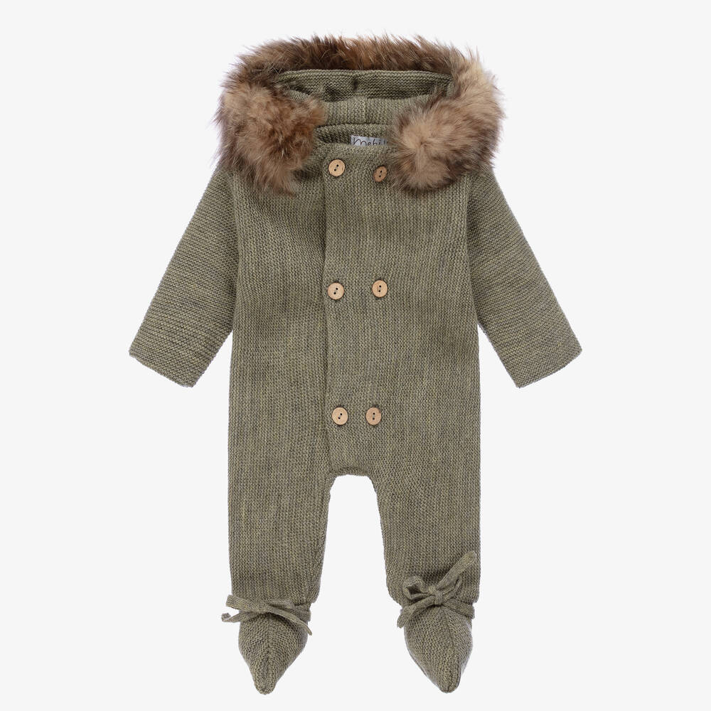 Cosy green pramsuit for baby boys and girls by Mebi. Knitted in a beautifully soft alpaca, wool and acrylic blend, this snuggly pramsuit easily fastens with wooden buttons on the front, and has sweet bows on the feet for an adorable finish. It comes with a detachable brown faux fur hood trim, making it a versatile piece for your little one's wardrobe.