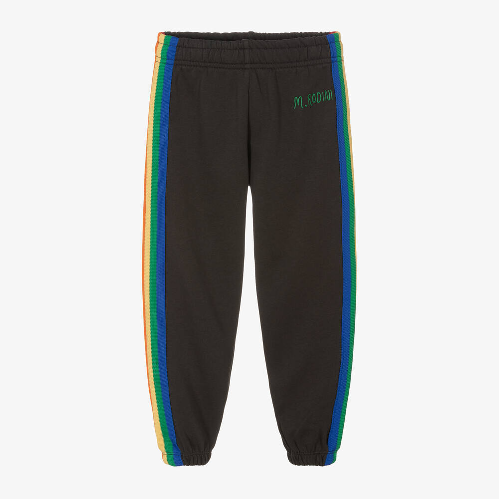Black joggers for boys and girls by Mini Rodini, made in soft, mid-weight organic cotton jersey. Casually designed with elasticated cuffs, they have a rainbow stripe taped trim down the sides of each leg. The designer's name is embroidered in green on the front and the waistband has an internal drawstring to ensure a comfortable fit.