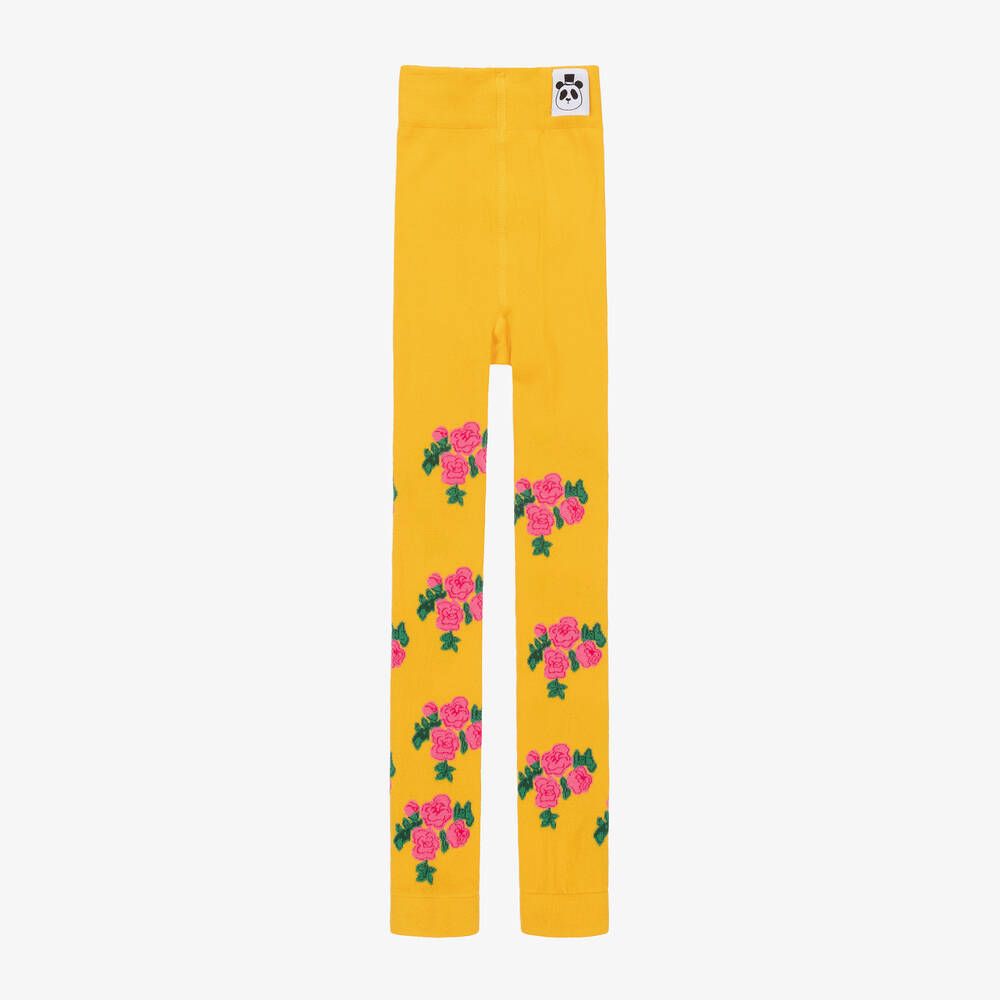 Bright and colourful, these yellow leggings for girls by Mini Rodini are made from a soft organic cotton knit. Super fun and vibrant, they have a pretty pink and green roses pattern for a striking look. Ideal for layering underneath skirts and dresses, they have an elasticated waist for comfortable wear.