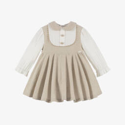 Charming pink and green cotton dress for baby girls by Spanish brand Miranda. Patterned with a ditsy floral print, the A-line dress has gingham ruffles on the shoulders to match the pull-up knickers. The dress is gently lined and fastens with pearly pink buttons on the back.