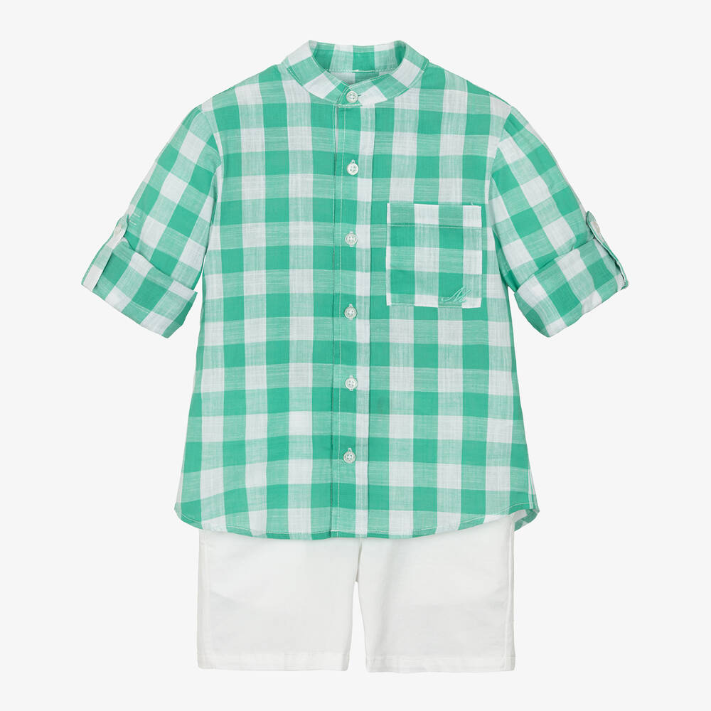 A charming green and white cotton shorts set for boys by Miranda. The lightweight, collarless shirt has a smart check design and tabs on the sleeves to neatly adjust the length. It comes with a pair of soft twill shorts, with useful front pockets, faux back pockets and an adjustable waistband for a comfortable fit.
