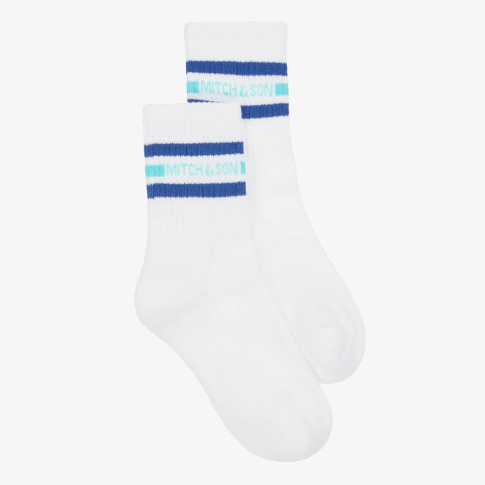 Sporty white socks for boys by Mitch & Son, made in a comfortable cotton blend. These gently ribbed socks have bright blue stripes and logo lettering around the ankle for a branded look.