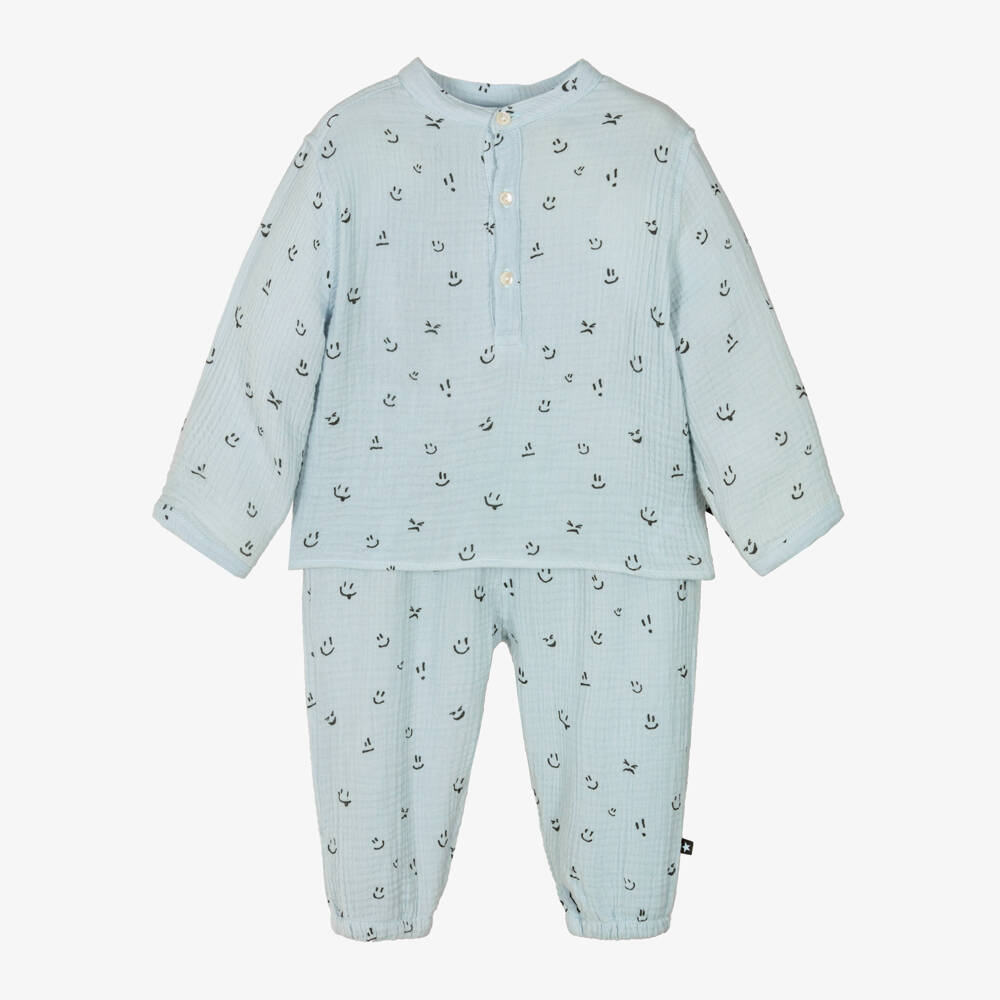 Pale blue trouser set for younger boys and girls from Molo, made in organic cotton muslin. Beautifully soft and lightweight, both pieces are patterned with funny face prints. The collarless top has button fastenings on the front and cuffs and the trousers have a gently elasticated waist for comfort.