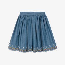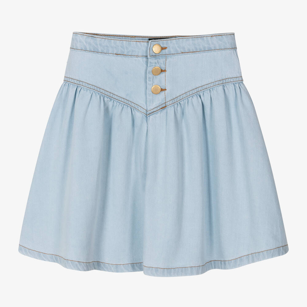 Pale blue denim skirt for girls by Molo, made in a cotton and lyocell blend with a soft, washed finish. Lightweight, it has gold-tone popper fastenings on the front and an adjustable waist for a great fit.