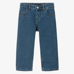 Light blue wash jeans for girls by Molo, made from organic cotton denim with a slight stretch for comfort. A cool, wide leg style, they have front seam detailing and patch pockets for a stylish, retro look. They fasten with a zip and branded popper and the waist is adjustable for a great fit.