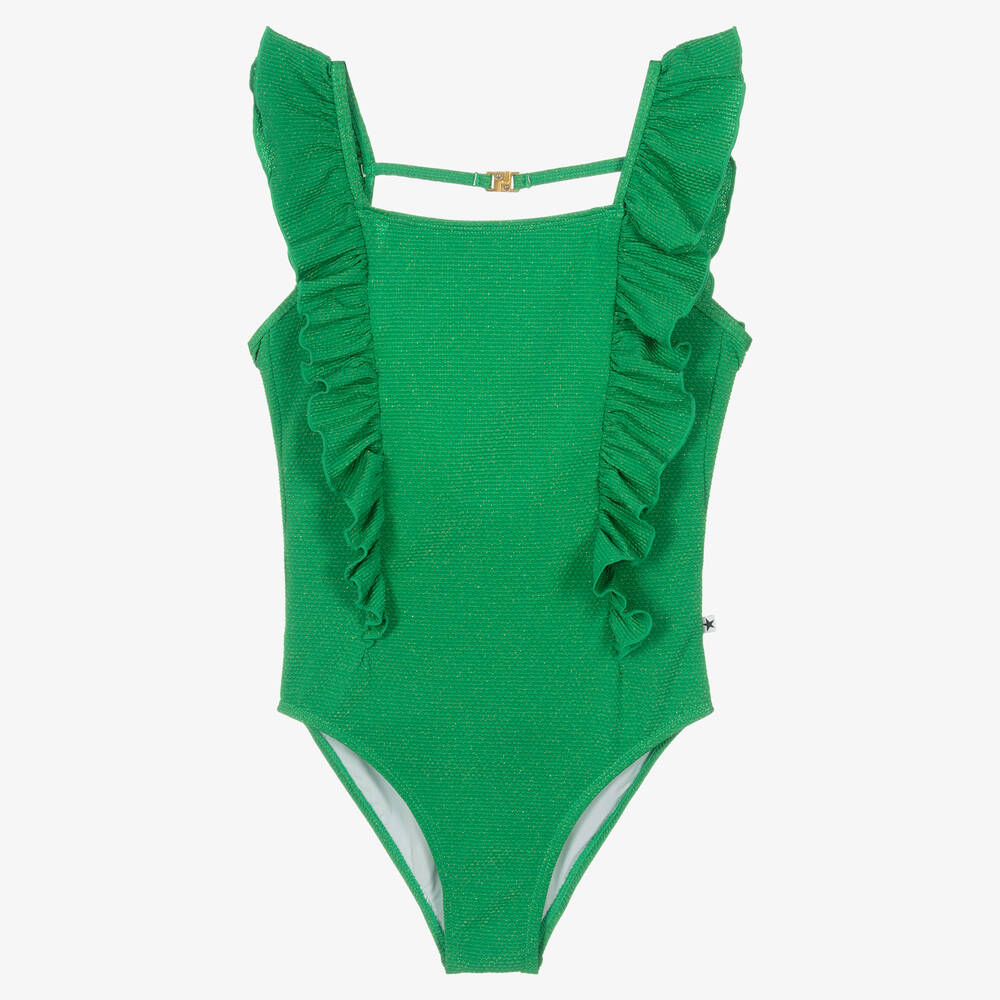 Stylish green and shimmery gold swimsuit for girls by Molo. It is made in soft and stretchy, waffle-textured nylon with full lining. The pretty ruffle trim on the shoulders and around the low scooped back gives it a flattering silhouette. There is a matt gold tone clasp fastening across the back to keep the straps in place.