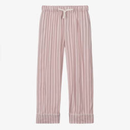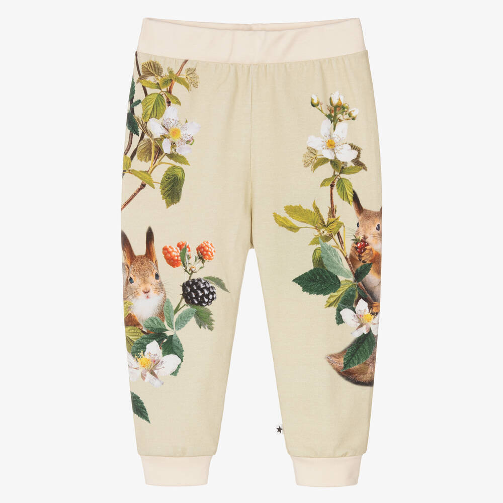 Pale green joggers for little girls from Danish brand Molo, made in soft organic cotton jersey. They have an elasticated ivory waistband and an adorable squirrel and bramble print on the side of the legs.