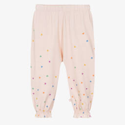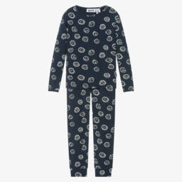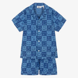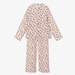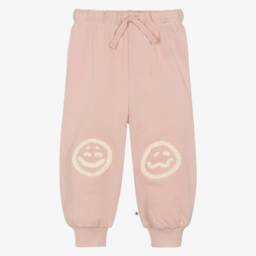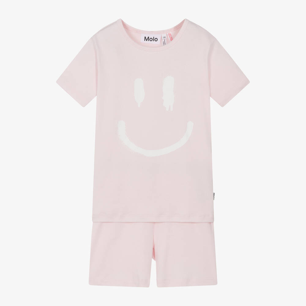 Pale pink pyjamas for girls by Molo, made in soft and stretchy organic cotton jersey. The short-sleeved top has a white, graffiti-style smiling face printed on the front and the matching shorts have a stretchy, elasticated waistband for a comfortable fit.