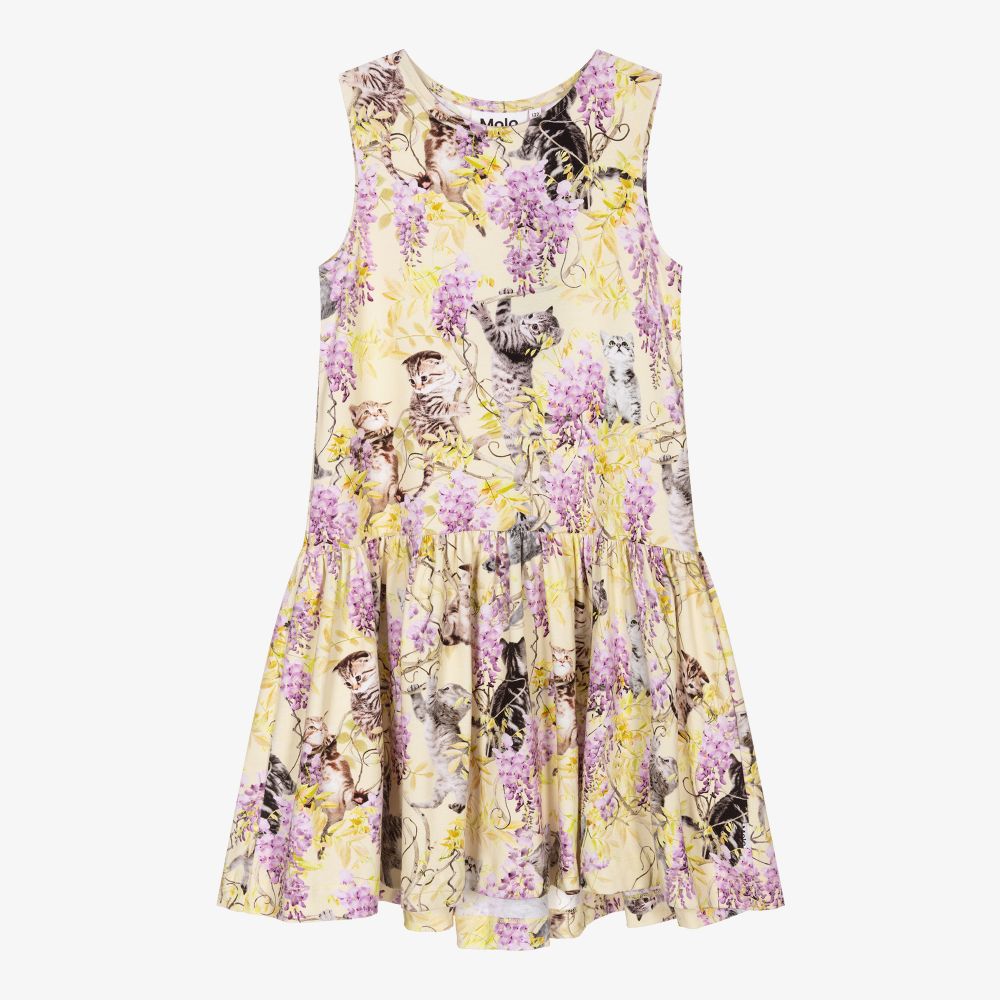 Cute yellow dress for girls by Molo, made in soft, stretchy organic cotton jersey. With a sleeveless design and gathered skirt, it has a lovely pattern of kittens and purple wisteria.