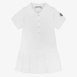 Little girls white, down padded dress by Moncler Enfant. Silky and lightweight, this warm and lightweight design is super warm and comfortable to wear. It has a front taped zip, with chin guard and a white logo print. The inside is lined in soft cotton jersey.
