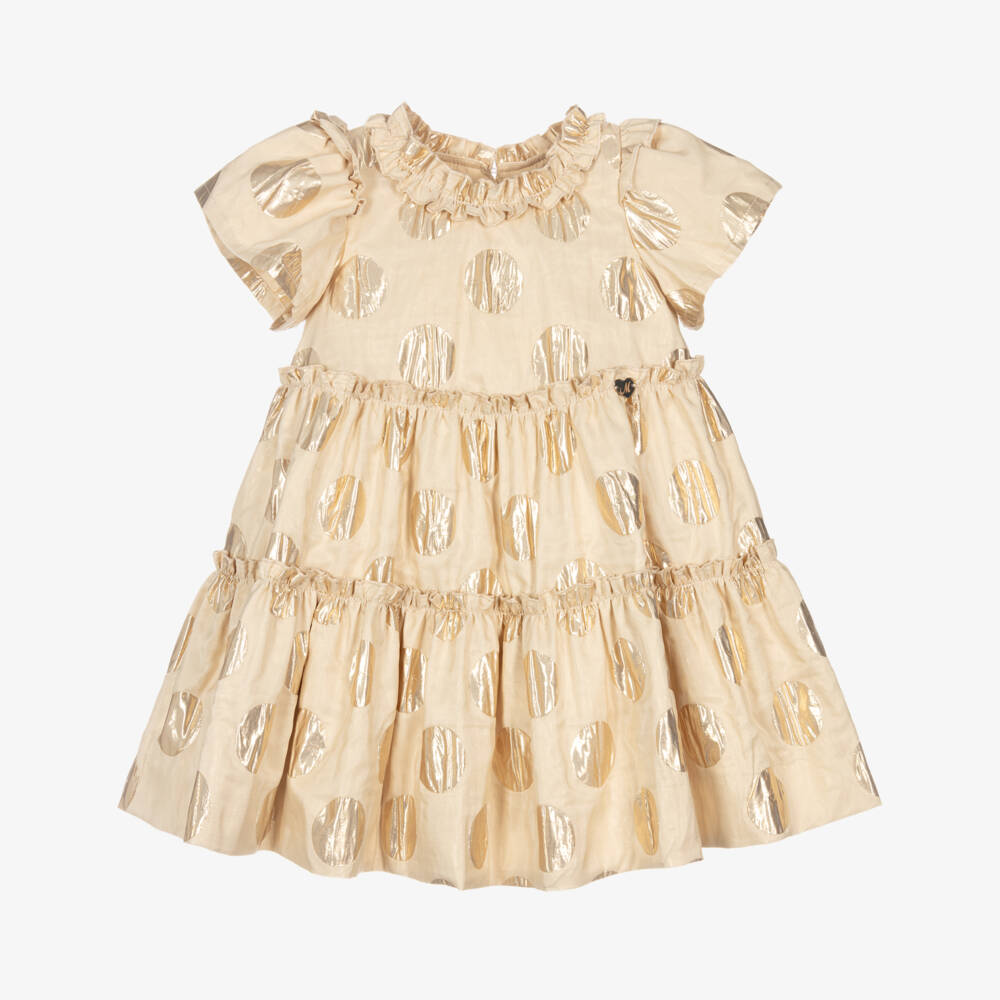 A beautiful golden dress for girls by Italian brand Monnalisa, ideal for special occasions. The soft fabric is woven with metallic gold polka dots that shimmer and shine in the light. Pretty ruffles add texture to her look. The dress is comfortably lined with cotton and the keyhole button closure on the back adds a classic touch.