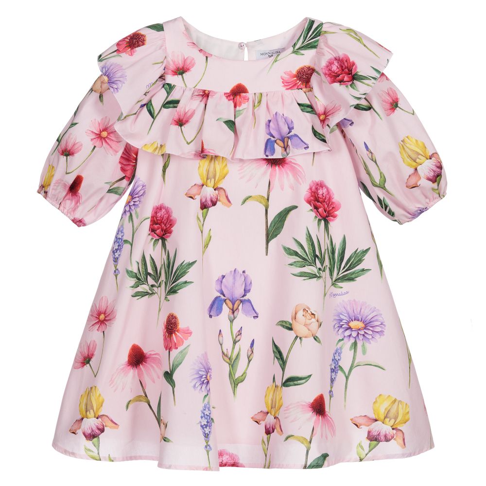 Girls pink cotton dress by Monnalisa, with a beautiful pink, purple and yellow floral design. It is made from smooth poplin, with a lightweight cotton lining. There is a large ruffle across the shoulders and it has lightly elasticated puff sleeves.