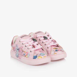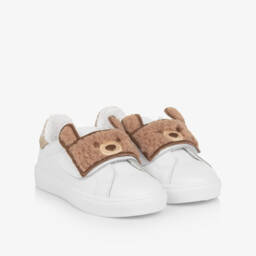 Beautifully sparkly, these red glitter trainers for girls by Monnalisa, have smooth white leather trims. Both stylish and comfortable, the velcro fastening strap is decorated with a bright red bow and silver metal logo charm. They are lined in soft leather, with a lightly cushioned insole and a non-slip rubber outer sole for good grip.