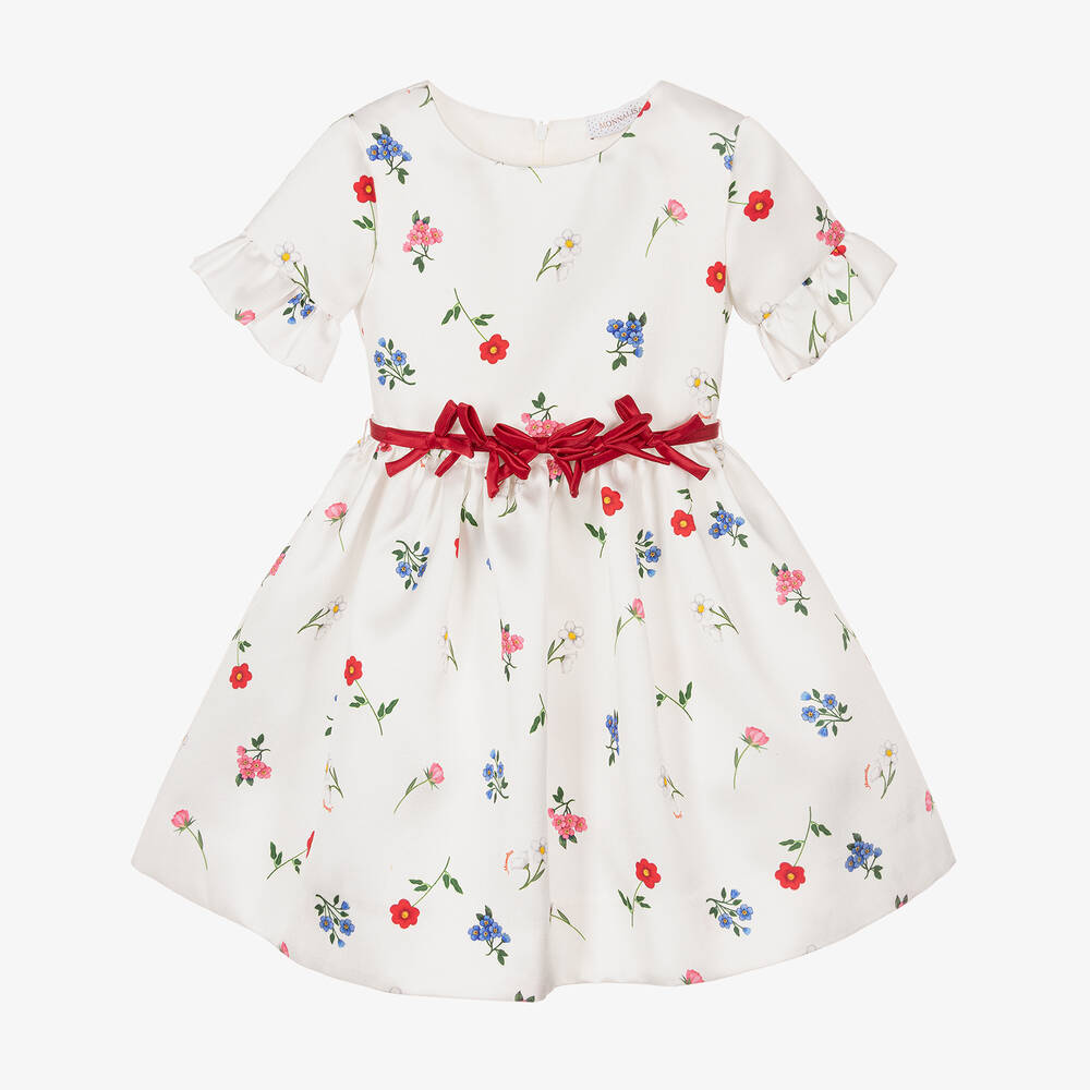 A gorgeous dress for girls by Italian brand Monnalisa, designed in white satin twill. This lovely style is patterned with colourful garden flowers for a charming look. It has a round neckline, frilly sleeves and a gathered waist to create a fit-and-flare silhouette. The dress is gently lined and fastens with a neat zip on the back. It comes with a detachable red belt with pretty bow ties on the front.