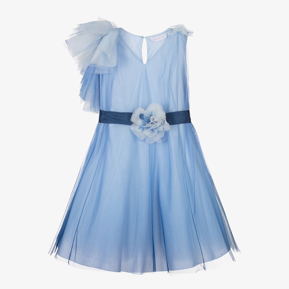 A lovely blue tulle dress for teen girls by Monnalisa. In ombré shades of blue, this special occasion design has a V-shaped neckline and a feature tulle ruffle on one shoulder. It comes with a removable navy blue grosgrain waist belt with a floral corsage in the centre to create a feminine silhouette. There is a stylish keyhole button fastening on the back and the dress has a comfortable lightweight cotton lining.