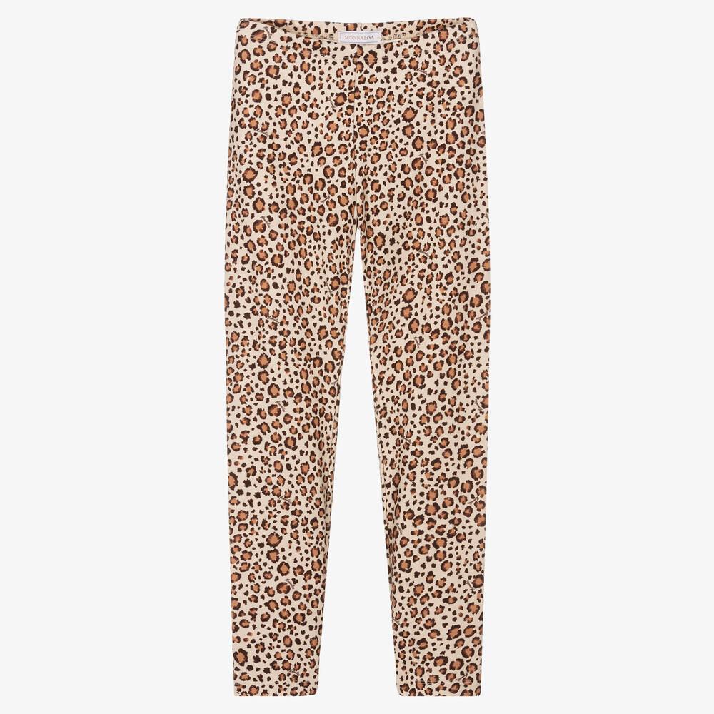 Beige and brown full-length leggings for teen girls by Italian brand Monnalisa. Amongst the fun leopard print pattern are subtle logo details for an added designer touch. They are made in stretchy viscose jersey, comfortable and breathable for all-day wear.