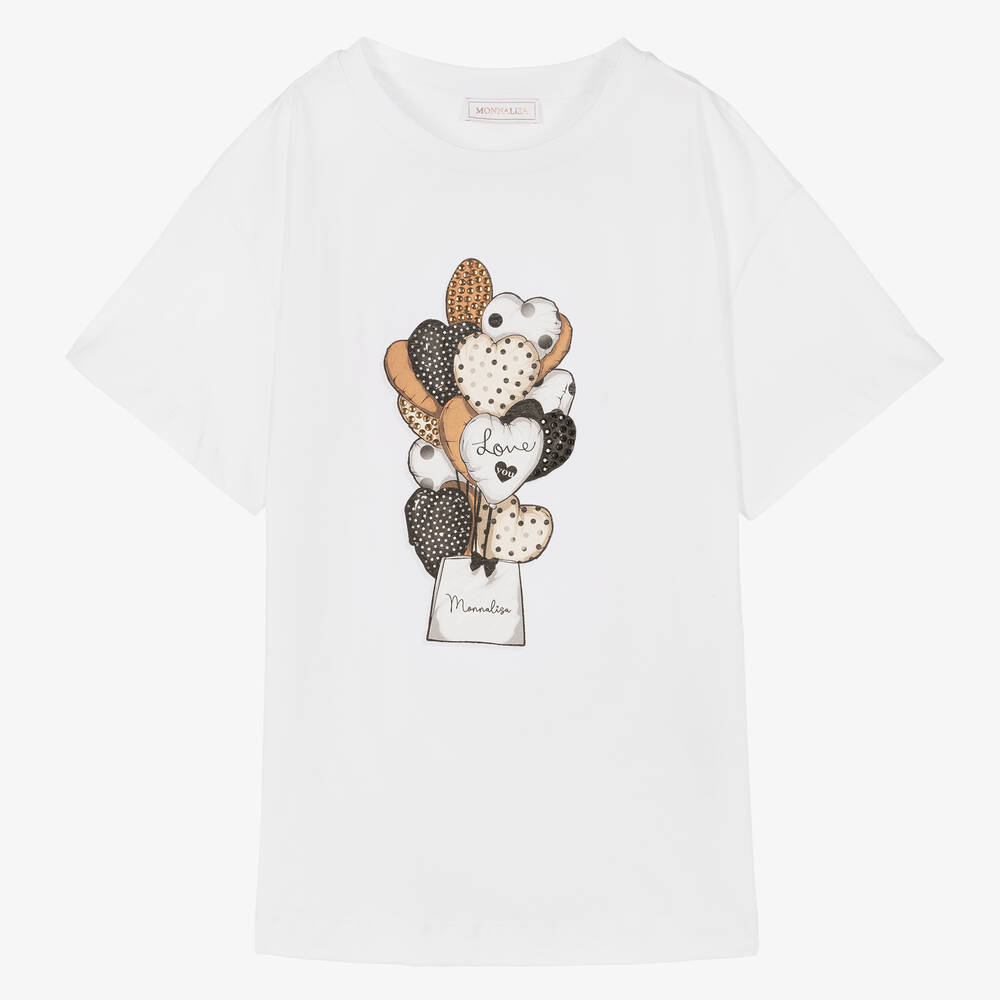 From Italian brand Monnalisa, a classic white T-shirt for teen girls, signed with a small, black logo script on the front. Synonymous with the brand, it has a heart-shaped balloon graphic on the front, decorated with sparkly beige and black studs. It is made in soft and stretchy cotton jersey for easy wear.