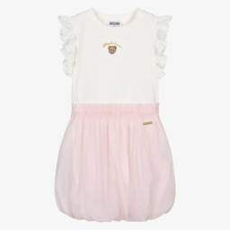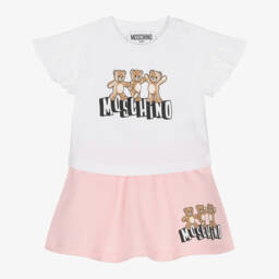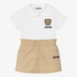 A cute ivory and blue denim skirt set for little girls by Moschino. The skirt has a gently elasticated waistband and adjustable, popper-fastening shoulder straps. Adding a distinctive designer touch, the iconic Moschino Teddy Bear is appliquéd on the front. An ivory T-shirt with black logo embroidery, completes the sweet look.