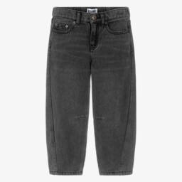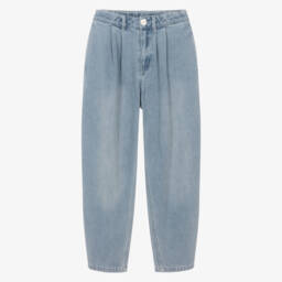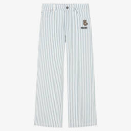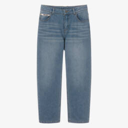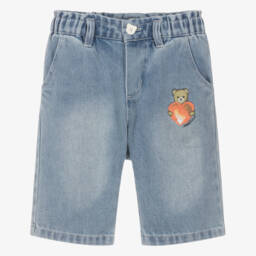 Cute washed blue denim jeans for younger boys and girls by Moschino, with a delightful Teddy Bear patch on the front. Made in soft, comfortable cotton, they have classic five-pocket styling and an elasticated waistband, gentle on little tummies.