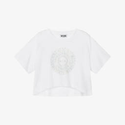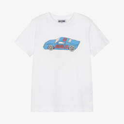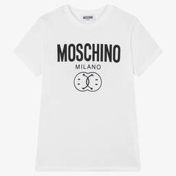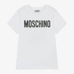 White T-shirt for baby boys and girls by Moschino, made in soft cotton jersey for comfortable wear. This casual style has a bold black logo motif on the front featuring three playful Moschino Teddy Bears. There are poppers on one shoulder to help with dressing.