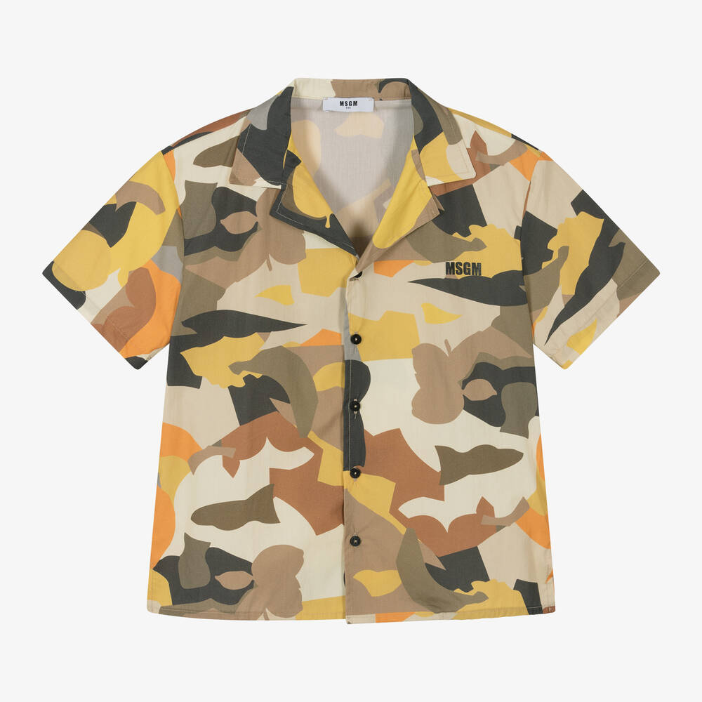 Boys brown shirt by MSGM, styled with a cool revere collar and a relaxed fit. Patterned with a colourful camouflage print inspired by the label's 'Safari' theme, it has a bold black logo print on the front and branded buttons to fasten.